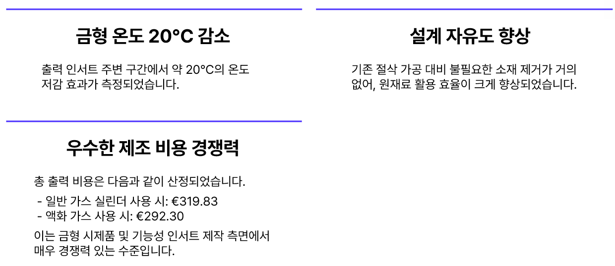 3D프린팅 공구강 인서트를 적용한 결과, 사출 테스트에서 즉각적이고 정량적인 성과가 확인되었습니다.