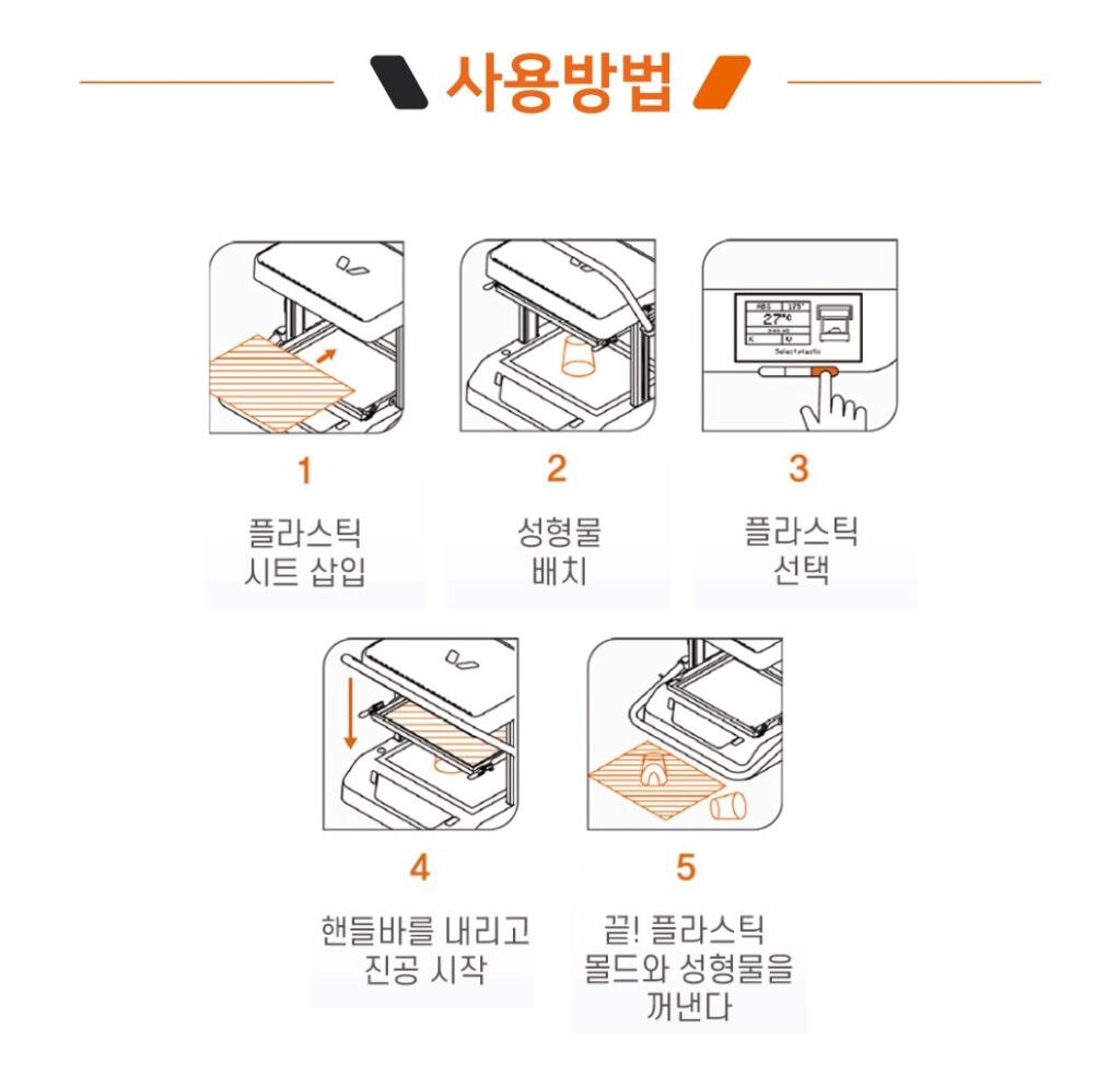 제품 디자인, 시제품 제작, 포장 개발 등 다양한 아이디어를 빠르게 실물로 구현할 수 있도록 설계되었으며, 진공성형을 처음 접하는 사람도 쉽게 다룰 수 있을 만큼 간단합니다.